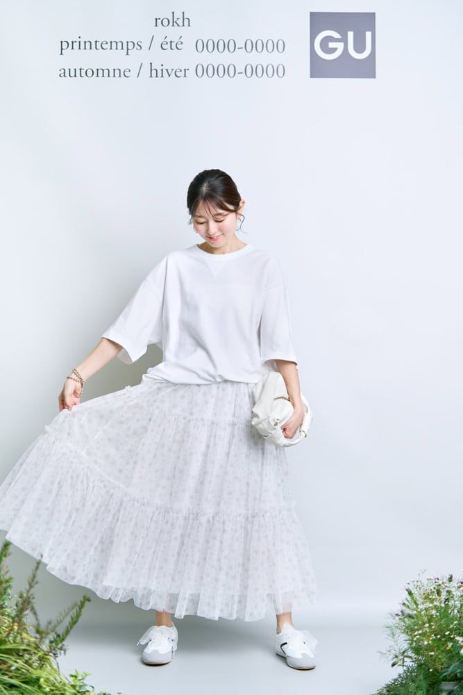 チュールスカート by rokh¥3,990 スウェットT(5分袖)¥1,290 リボンスニーカー¥2,990(すべてジーユー)※スカートはM、TシャツはLサイズを着用
