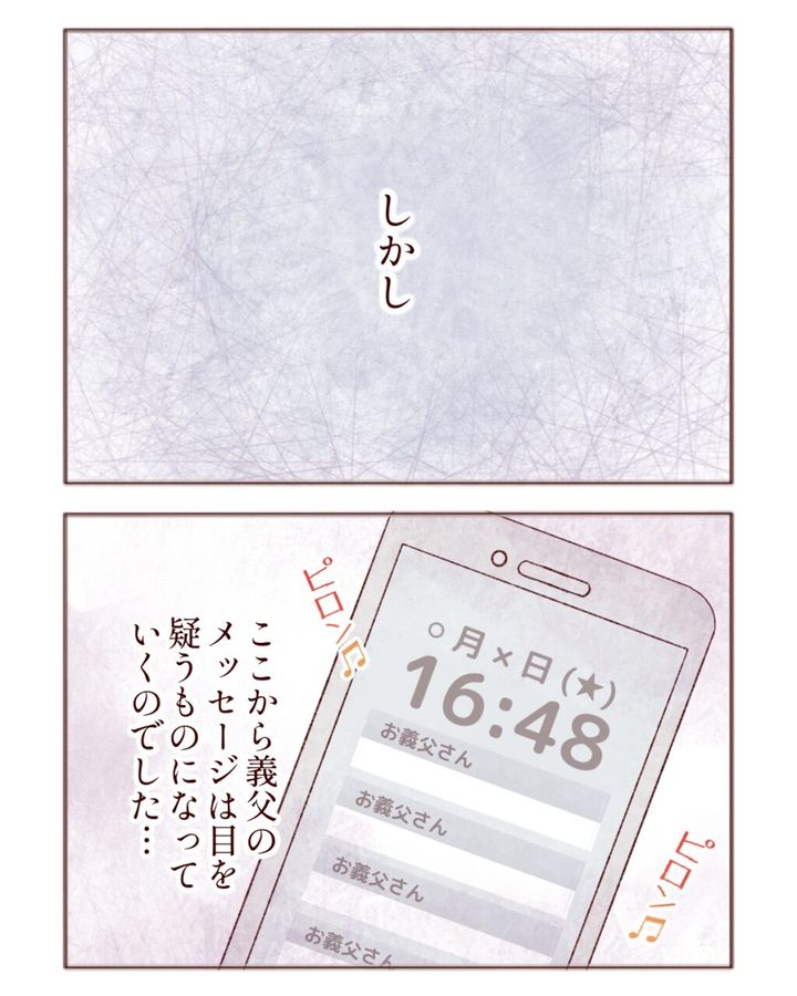 義父から頻繁にメッセージが来ることをコウイチさんに相談するも、「親孝行だと思って付き合ってあげてよ」と言われてしまったカナコさん。それからも毎日毎日朝と夕方に義父から連絡があり、最初にカナコさんが反応してしまったことで、後には引けない状態になってしまいました。