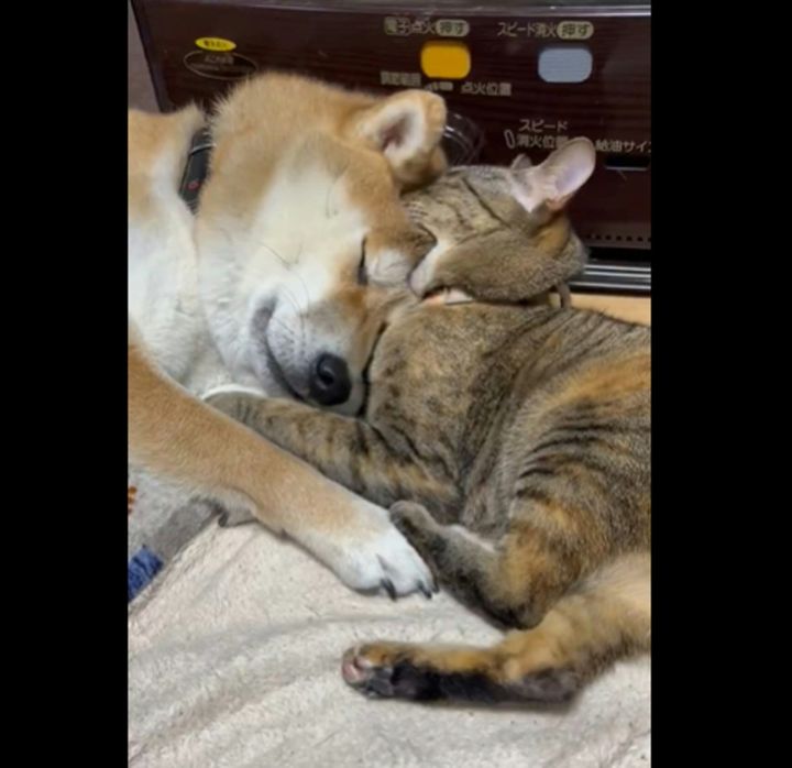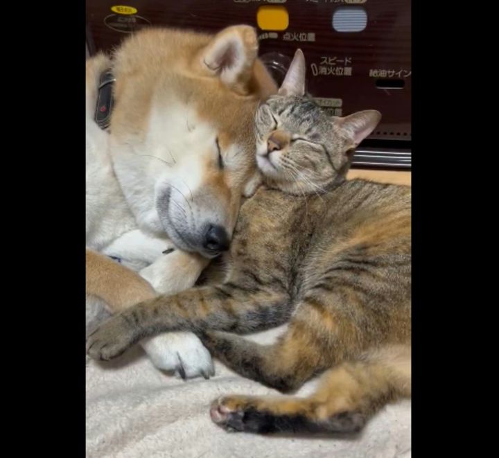 ぴったりと寄り添って眠る、愛犬と愛猫の平和な日常