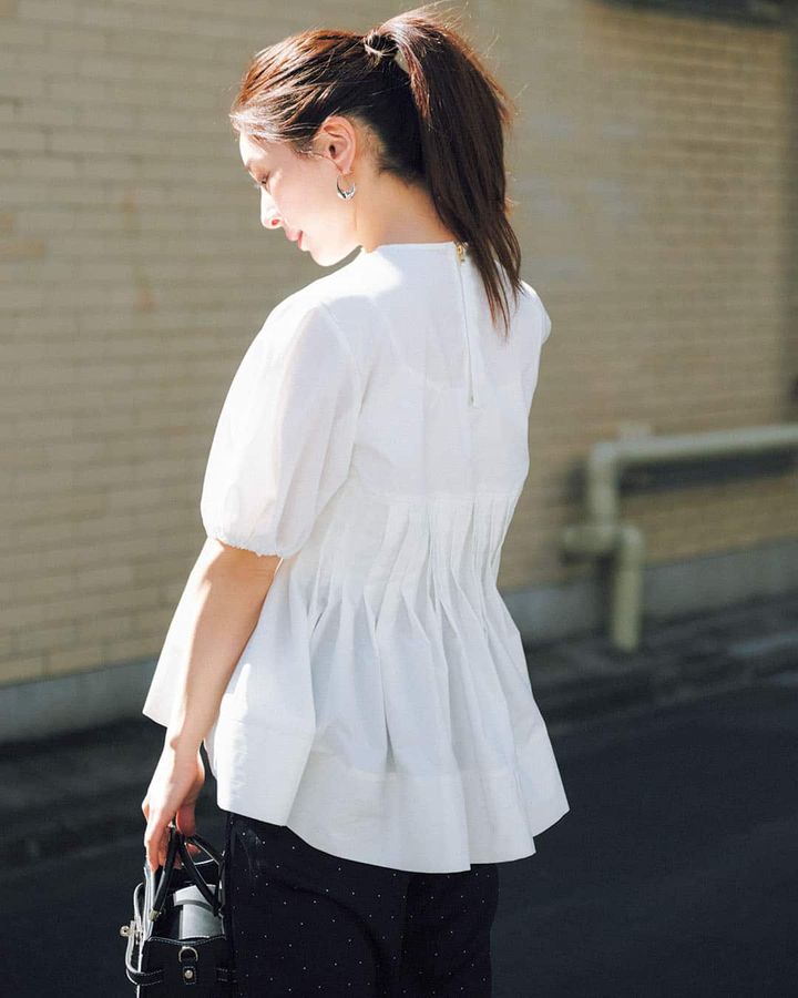 ②生地をふんだんに使用した「タックプリーツブラウス」で高見え