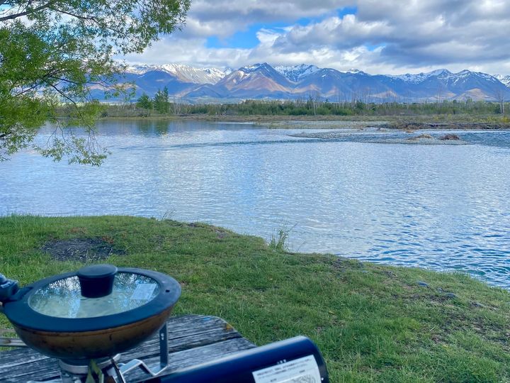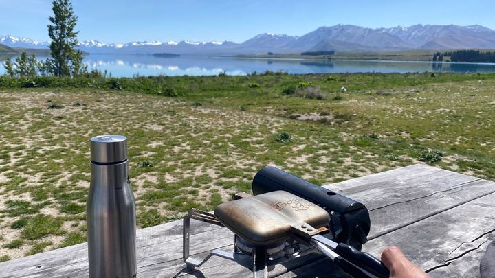 ニュージーランドの有名なテカポ湖のほとりでも、ホットサンドを作って食べました。ベンチとテーブルがあったので、絶景を眺めながらの贅沢な時間を過ごすことができました。