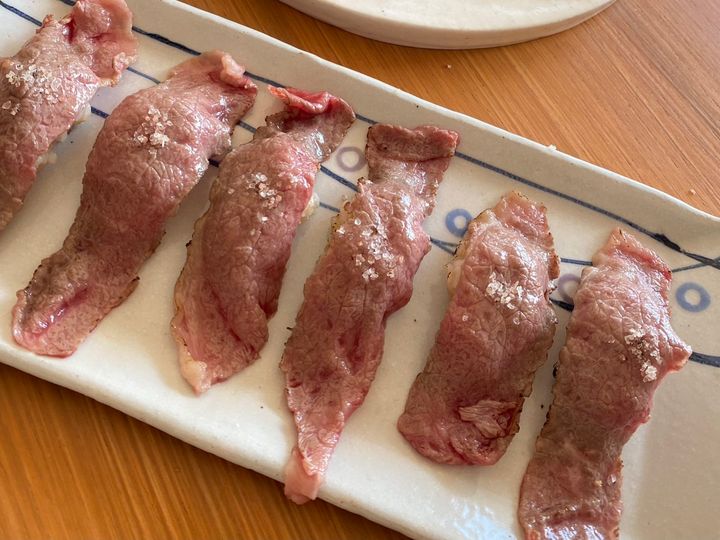 薄切りの美味しい牛肉を買ってきて、お家で肉寿司。トリュフ塩を乗せたら絶品でした…!