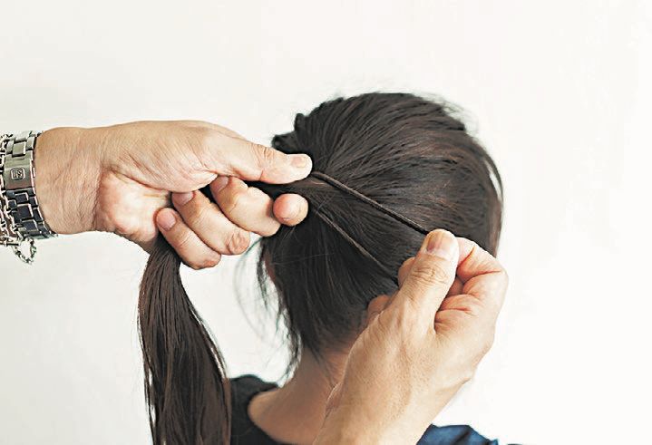 ルーズな毛流れが今っぽいオールバックひとつ結び。内側の毛を巻くことは省略し、表面に出てくる髪だけをストレーターで巻くので時短が叶います。ウェーブにし、ルーズに仕上げているので、産後抜け毛によるピンピン立つ毛も目立ちません。