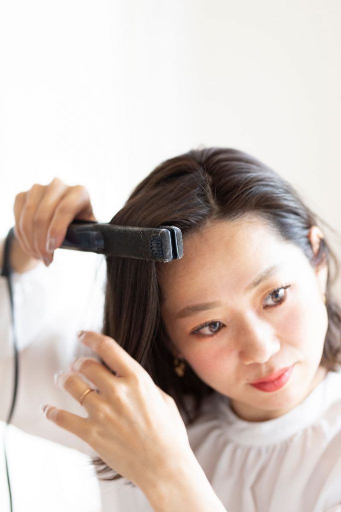 ジェルを使ってスタイリング。ペタッとさせないために、根元のボリュームをキープしながら、手ぐしでざっくりセットするのがポイント。さらにスプレーで固めれば、長時間のお出かけでも崩れずキープできます。