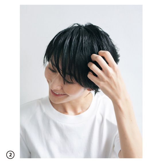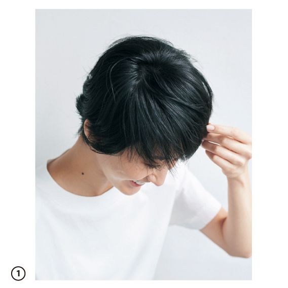 ➀つむじを中心に手櫛で髪を分ける。分け目をはっきりさせないことで自然な仕上がりに。