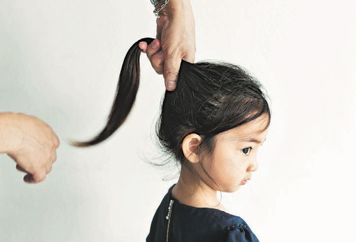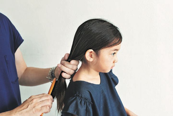 ➀髪全体を丁寧にとかします。子どもの髪は細く、垂れやすいので、結びたい位置より高めのポイントに向かってブラシでとかし、ひとつにまとめます。