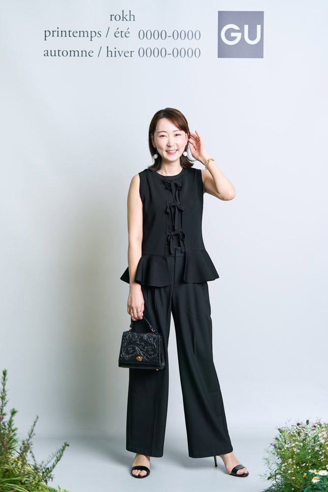 フロントリボンがかわいいノースリーブは、カジュアルな雰囲気もありつつ細部に至るまでエレガントさが美しいrokhらしいデザインが◎。ウエストラインを美しく引き立てるペプラムデザインがフェミニンさと上品さを両立してくれます。黒で統一することで引き締まり、ちょっとした華やかな場のお出かけシーンにも大活躍。一枚での着用はもちろん重ね着など着回しがきくので、真夏まで快適に着用できそうな逸品。