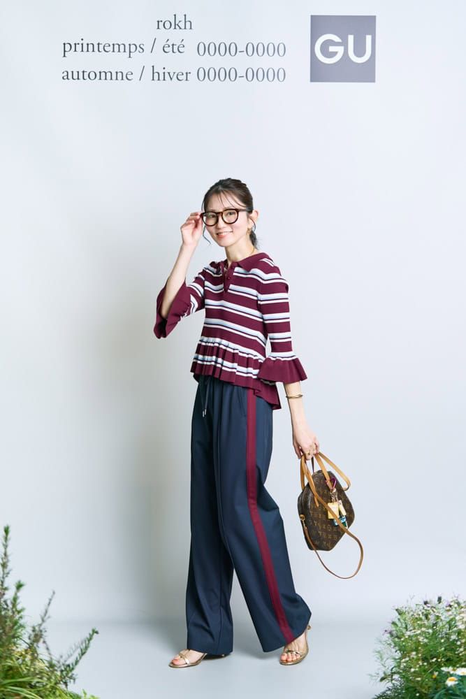 ボーダーリブポロセーター(7分袖) by rokh¥2,990 トラックパンツ by rokh¥3,990 UVカットウェリントンサングラス¥990(すべてジーユー)※ニットとパンツはMサイズを着用 バッグ、シューズ(ともに私物)