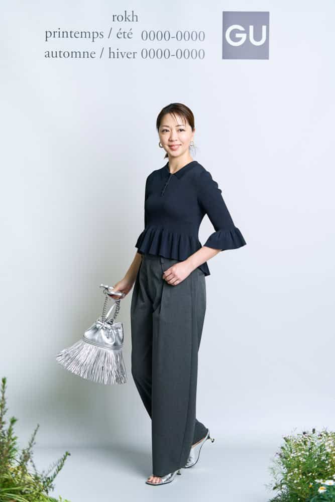 フロントリボンセーターby rokh ¥2,990 リブタンクトップ ¥990(一部店舗およびオンラインストアのみ販売) タックワイドパンツ¥2,990(すべてジーユー)※タンクトップ、セーター、パンツはMサイズを着用 バッグ、サンダル(ともに私物)