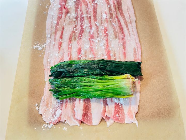 3.手前からほうれん草の茎、葉の順に並べる。手前からしっかりと巻き、表面に小麦粉を振る。