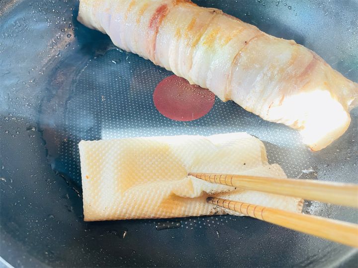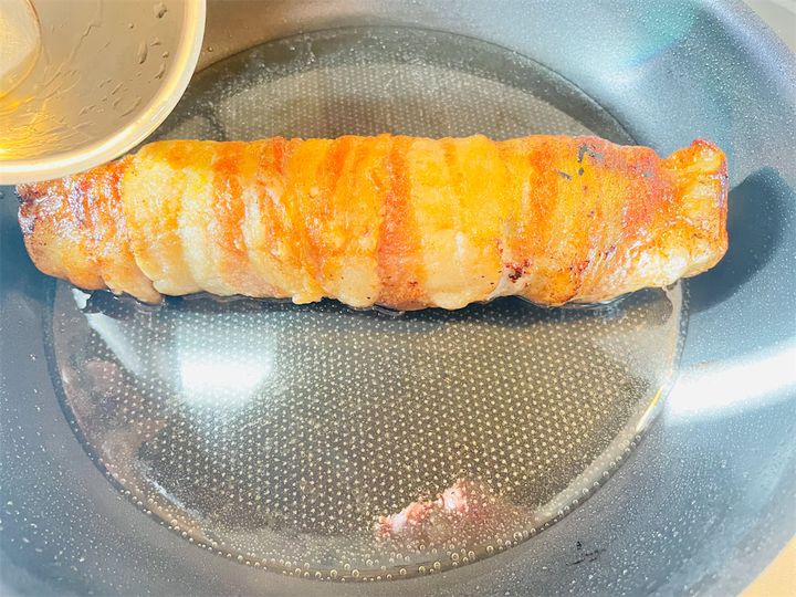 4.フライパンにサラダ油を中火で熱し、3の巻き終わりを下にして並べる。全面に焼き色がついたら、お酢を加えてフタをして、5分ほど蒸し焼きにする。