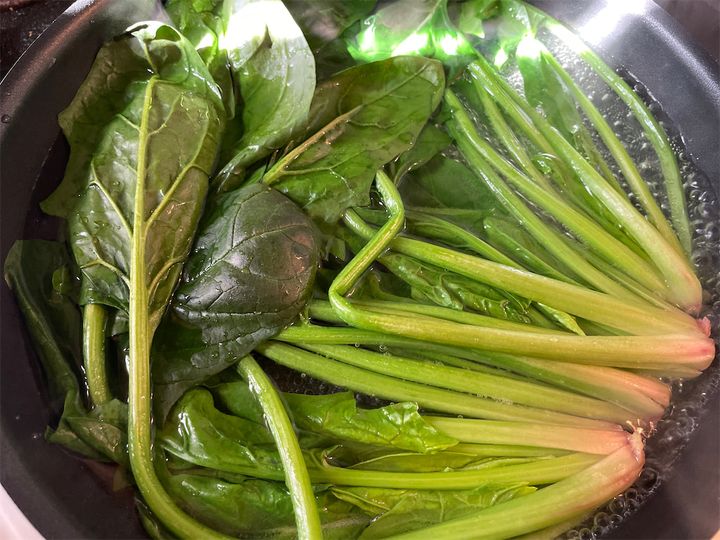 1.ほうれん草はさっと茹でて粗熱を取る。しっかりと水気を絞って、茎と葉に切り分ける。