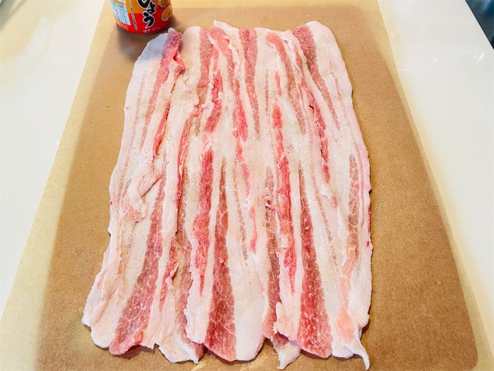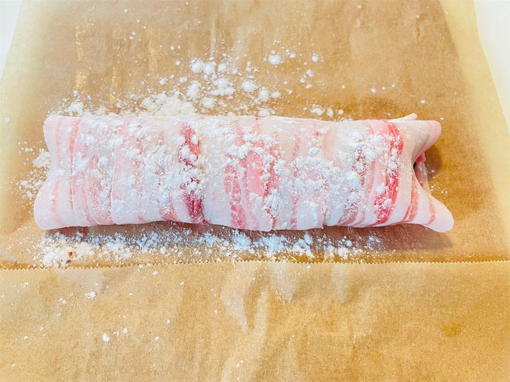 2. 豚バラ肉を少し重ねて並べ、塩、こしょう、小麦粉を振る。