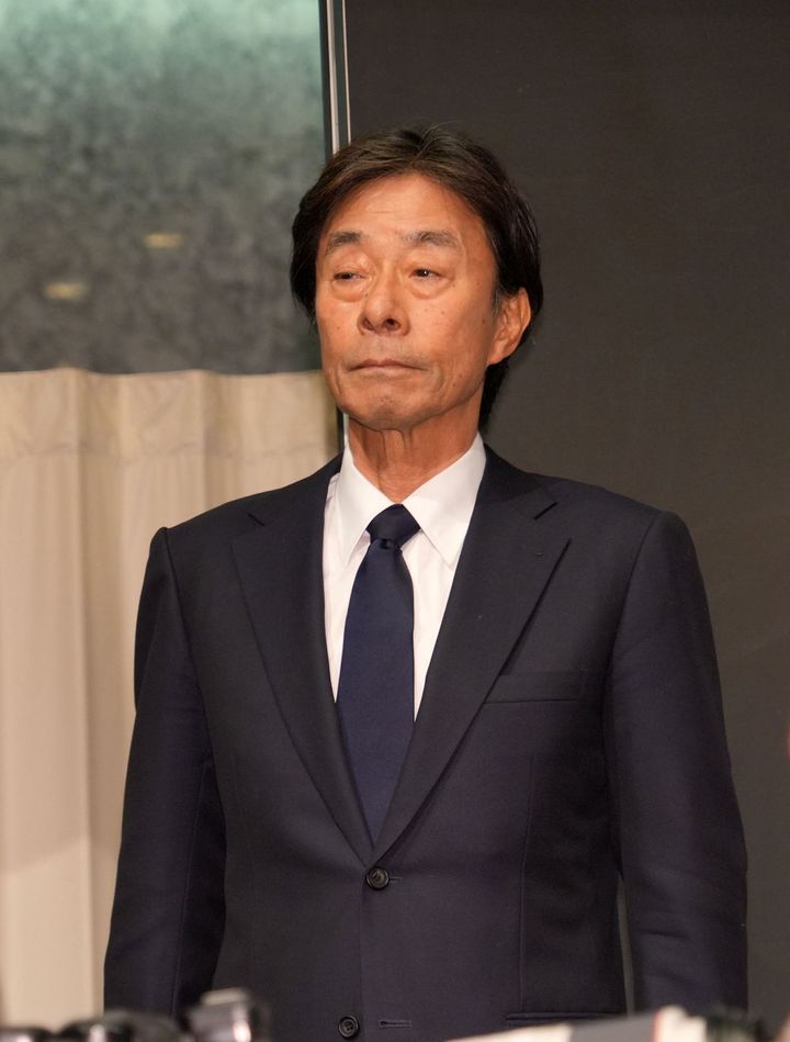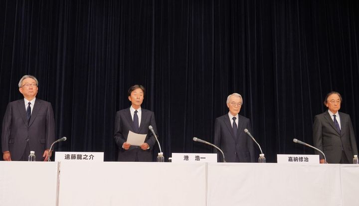 2025年1月27日の記者会見で辞任を発表した港浩一前社長ほか