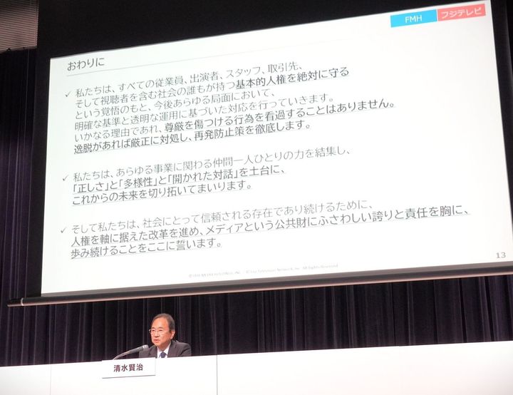 2025年3月31日のフジテレビ会見にひとりで登壇した清水賢治社長