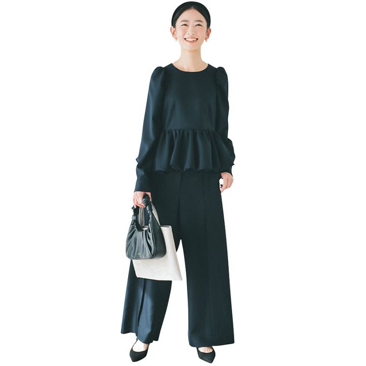 バルーンペプラムトップス¥15,400、ハイウエストワイドタックパンツ¥17,600(ともにVERSEAU/VERY STORE)カチューシャはChapeau d’Oで購入。