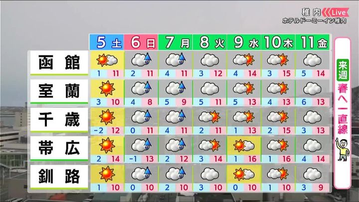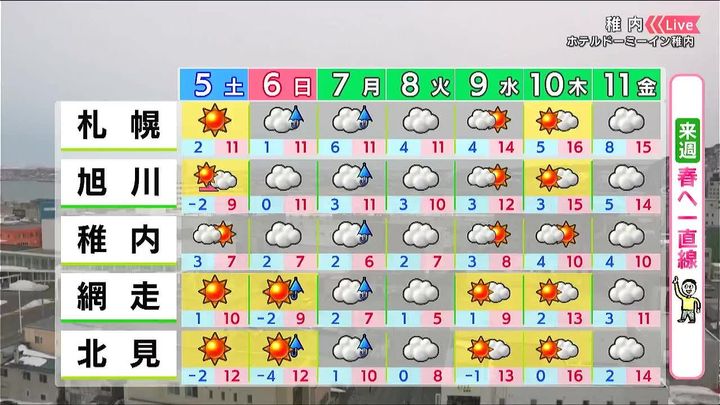 日曜日は札幌やオホーツク海側で夕方以降、弱い雨が降りそうです。月曜も通り雨があるでしょう。来週後半は日差しが出て最高気温が15度くらいまで上がります。春へ一直線です。