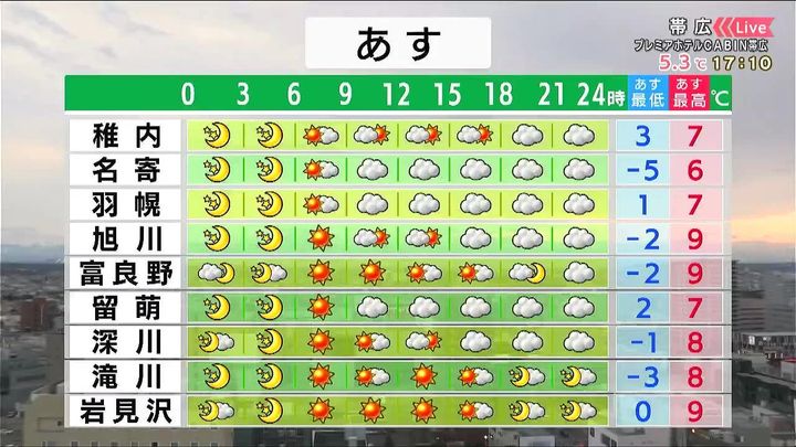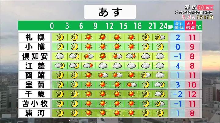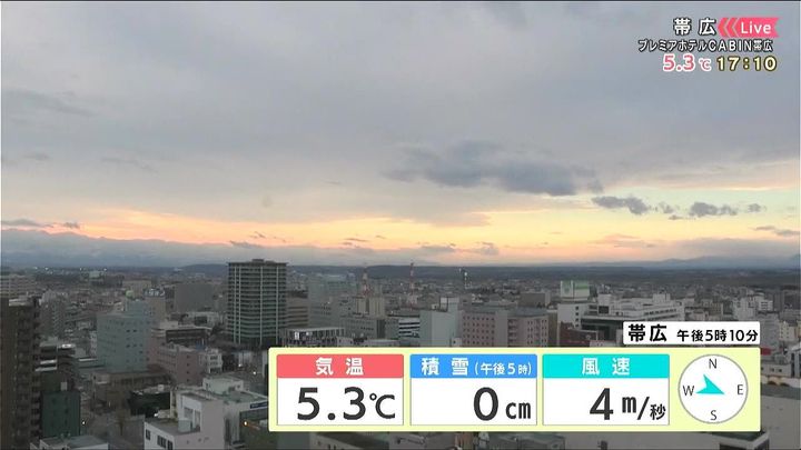 帯広は曇っていますね。あす5日(土)は一日を通して晴れて、帯広では大型連休ごろの暖かさになります。