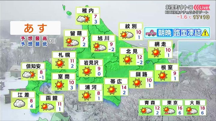 春の日ざしに恵まれ、風も弱く穏やかです。最高気温は10度前後です。オホーツク海側も2ケタで、帯広は14度でしょう。ただ、朝晩は0度くらいまで下がるので、路面凍結に注意して下さい。