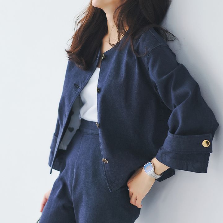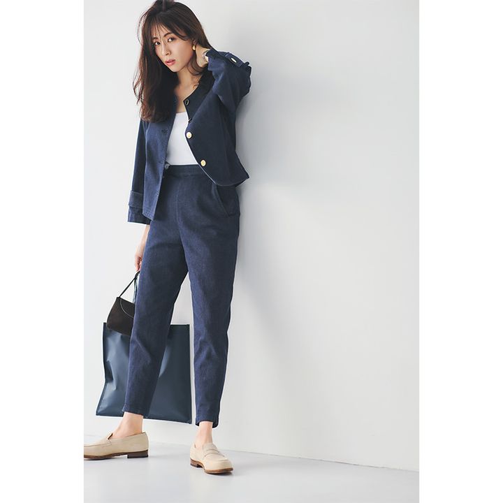 ボタンなし、サイドジップで着られるテーパードパンツ×ノーカラージャケットはまさに母スタイルの代名詞。母業の新定番にしたいセットアップです。