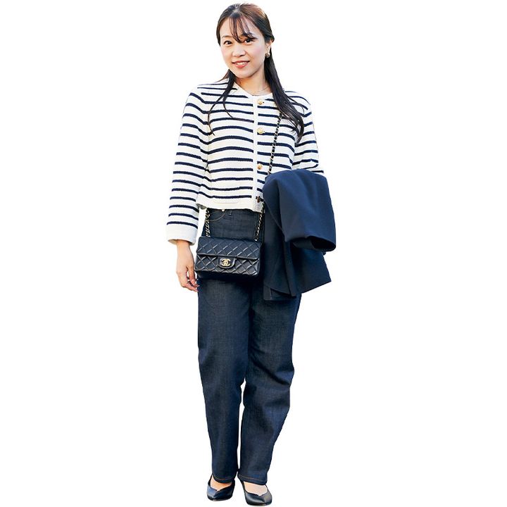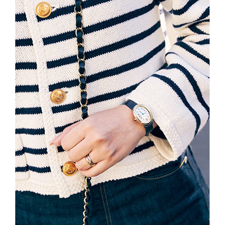 カジュアル感の強いボーダーも、小物のゴールドで華やかをプラス。ネイビーサテンのベルトにカスタムしたカルティエのベニュワールとデニムの色みが好相性。