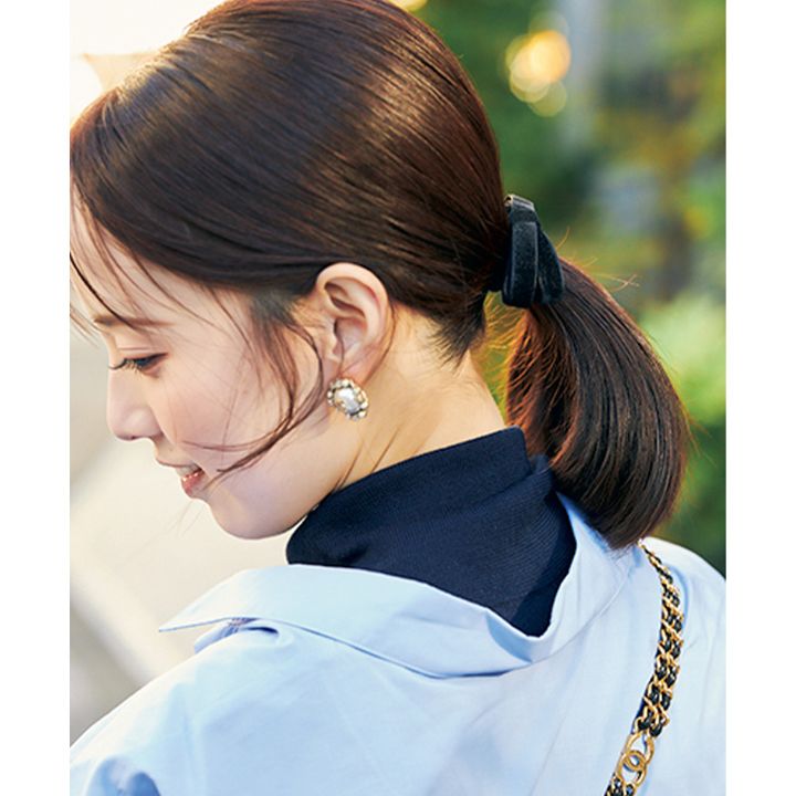公園にぺたんこ靴の日はロールアップ、ヒールの日は伸ばして丈感の変化を楽しみます。服がシンプルな分、顔周りにパールやベロアリボンで甘さをオン。