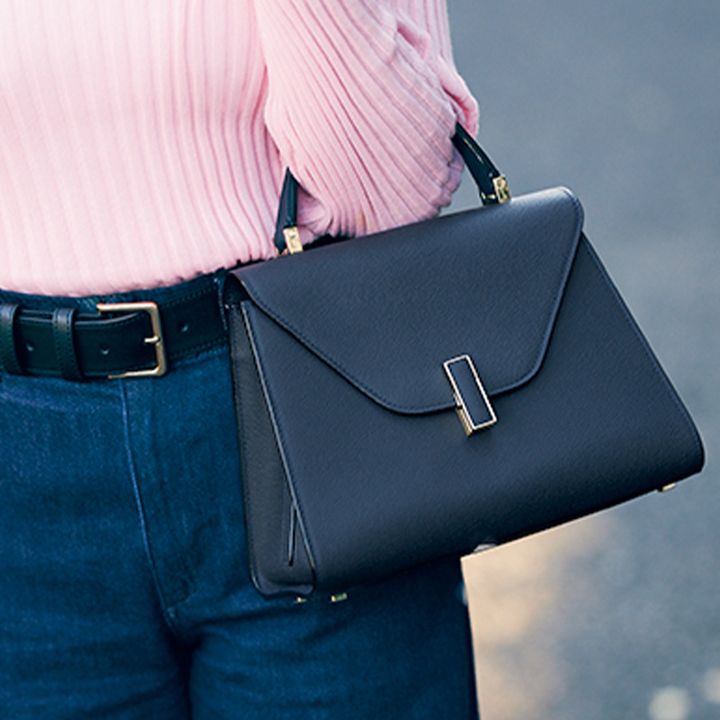 濃紺と赤の濃い色同士のコーデを思いっきり楽しんでも派手になりすぎず、品よくまとまる。