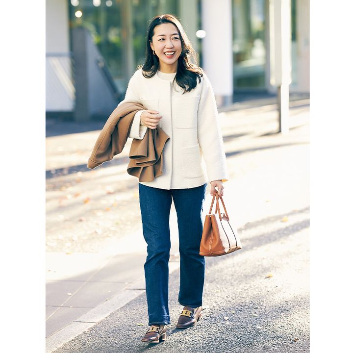 通勤用に2-3cmヒールにもローファーにも合うストレートをチョイス。白と茶系でまとめた通勤スタイルをデニムに変えるだけでこなれ感も機動力もup!