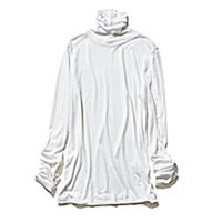 タートルからでものぞく高めのえりがスタイリングの洗練化に貢献。すそやそで口にも小さな白をちりばめることで、緊張感のある白シューズも浮かずにはける。