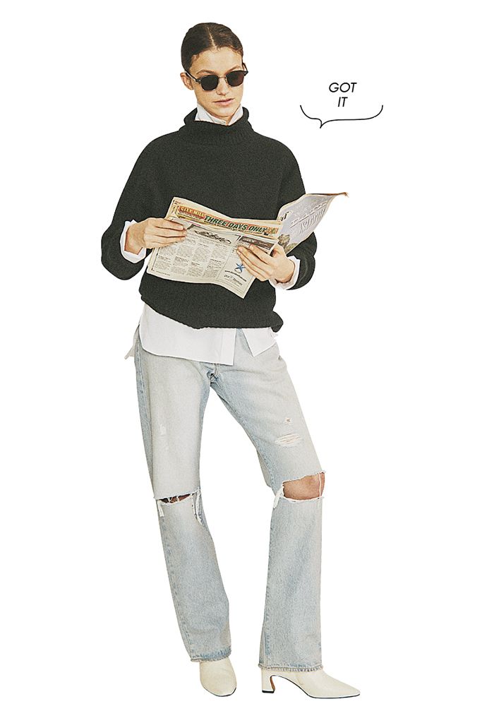 黒ニットは着まわし。中に着た白シャツ/コキュカ(ザ・ストア バイ シー 代官山店) ダメージデニムパンツ/Levi’s®(リーバイ・ストラウス ジャパン) サングラス/THE BEDFORD HOTEL(キングスター) アイボリーショートブーツ/A de Vivre