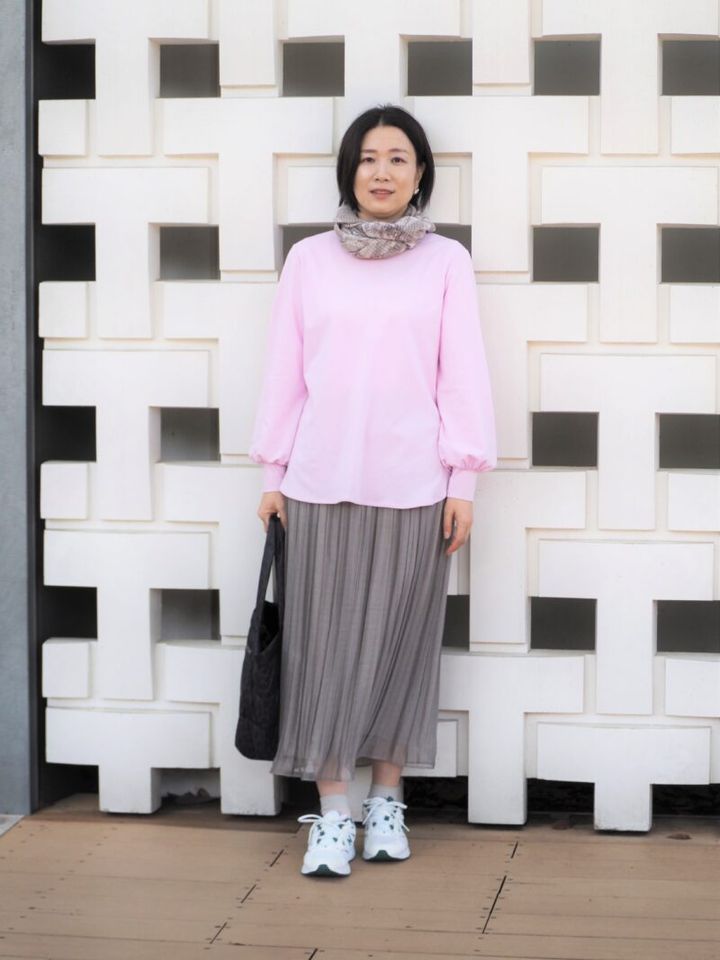 冬はダークなアイテムを身につけることが多いというSHIROさん。この日は、顔まわりがパッと明るく見えるベビーピンクのトップスをセレクト。桜のシーズンにマッチする爽やかな着こなしが◎。軽やかなプリーツスカートにスニーカーを合わせたお散歩スタイルで代官山へ。