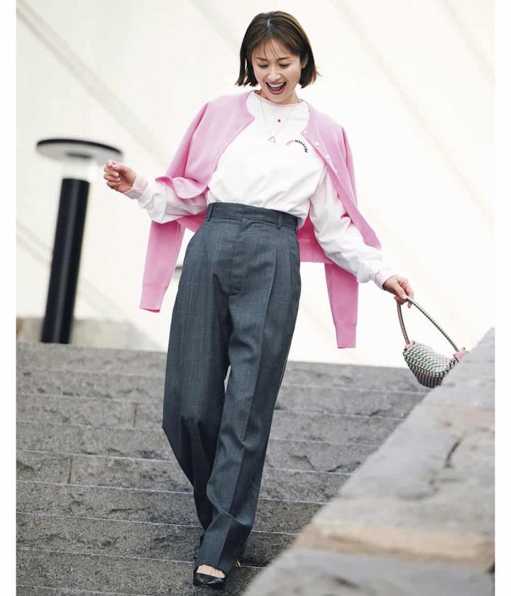 思わずピンクに心惹かれる春。淡いピンクのカットソーに一段濃いめのカーデを合わせたグラデコーデで顔周りに柔らかな奥行きを。開花の喜びを全身で味わいたいお花見シーズンはもちろん、オシャレな印象を残したい週1~2の出社にも◎。