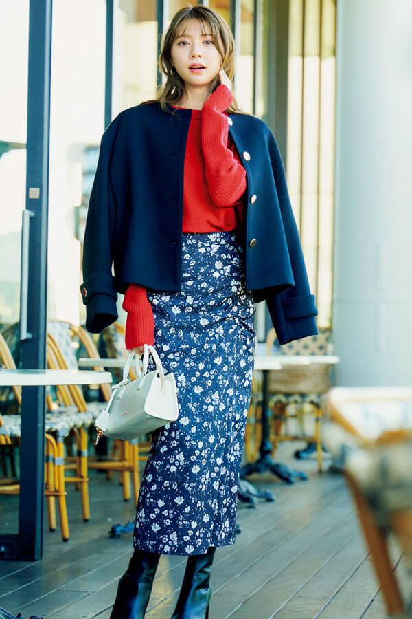 小花柄スカートに赤ニットとネイビージャケットのパリっぽ配色でおめかし♡ ナローシルエットのスカートは目立ってしまうお腹や腰周りの丸みも、小花柄&ギャザー入りならスマートになじませることが可能。後ろはゴム入りなのではき心地も上々です。