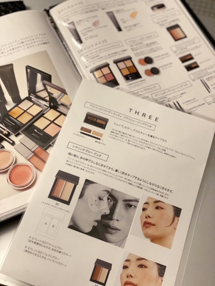 ①施術後、5つのブランドから好きなブランドを1つ選択。ブランドの説明と製品の使い方まで載った資料はAMATA美香さんの手作りです。