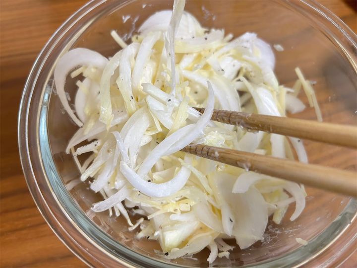 2. 10分経ったところで1の新玉ねぎをボウルに移し、ピザ用チーズ(20g)、マヨネーズ、塩、こしょうを加えて混ぜ合わせます。