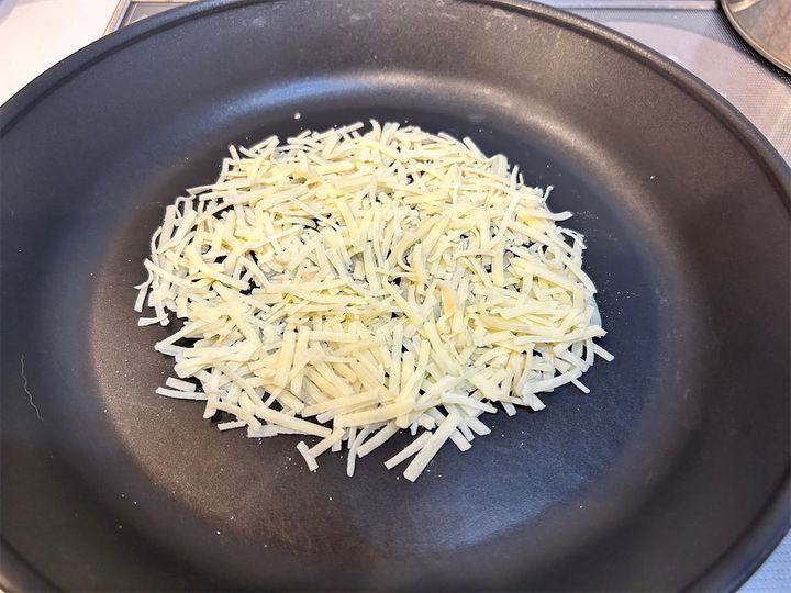 3. フライパンにピザ用チーズ(50g)を広げます。
