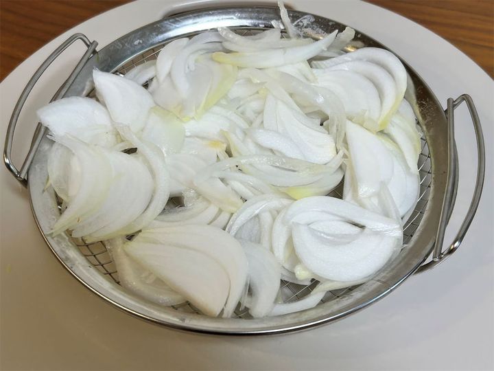 スライスした新玉ねぎを10分程度置いて、空気にさらします。動画では平ザルに広げていましたが、筆者は野菜を蒸すときに使うカゴで代用しました。