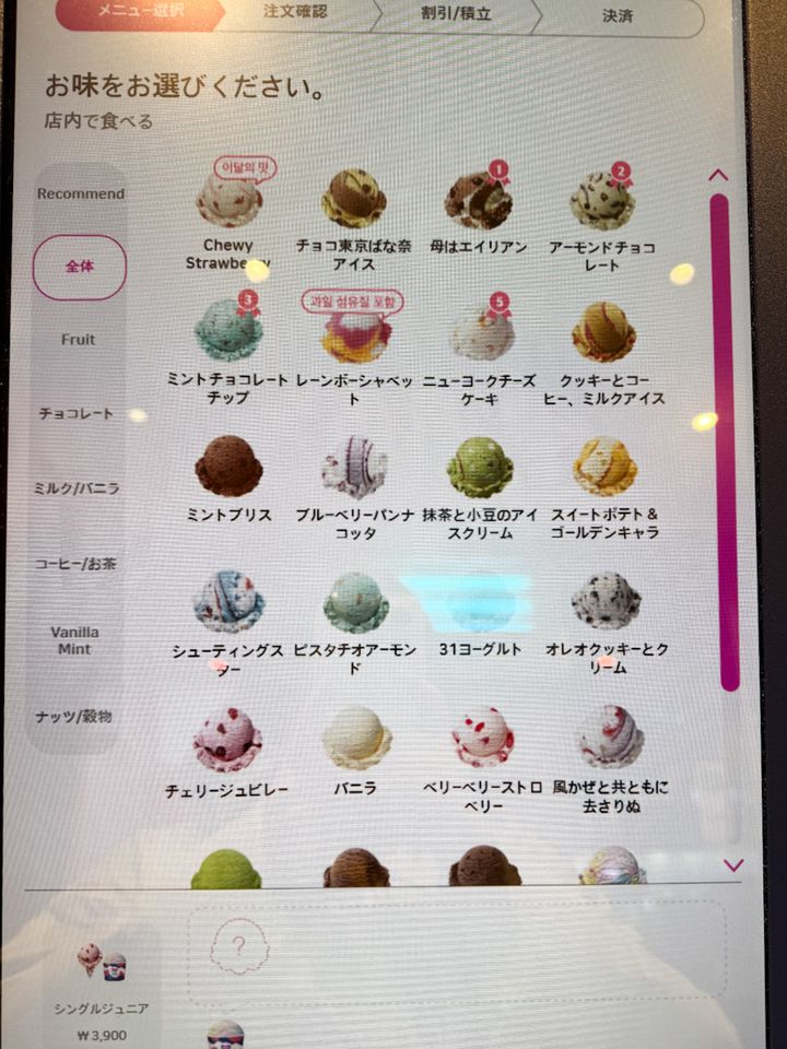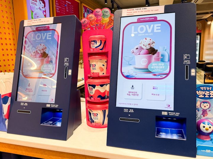 韓国のバスキンロビンスでは、対面で注文する以外に、キオスク端末(セルフ注文機)を使うことも可能。