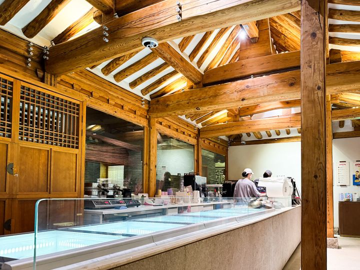 この店舗は、韓国の伝統家屋「韓屋(ハノク)」を活かしたデザインになっており、通常のアイスクリームショップとは一味違う雰囲気を楽しめます。