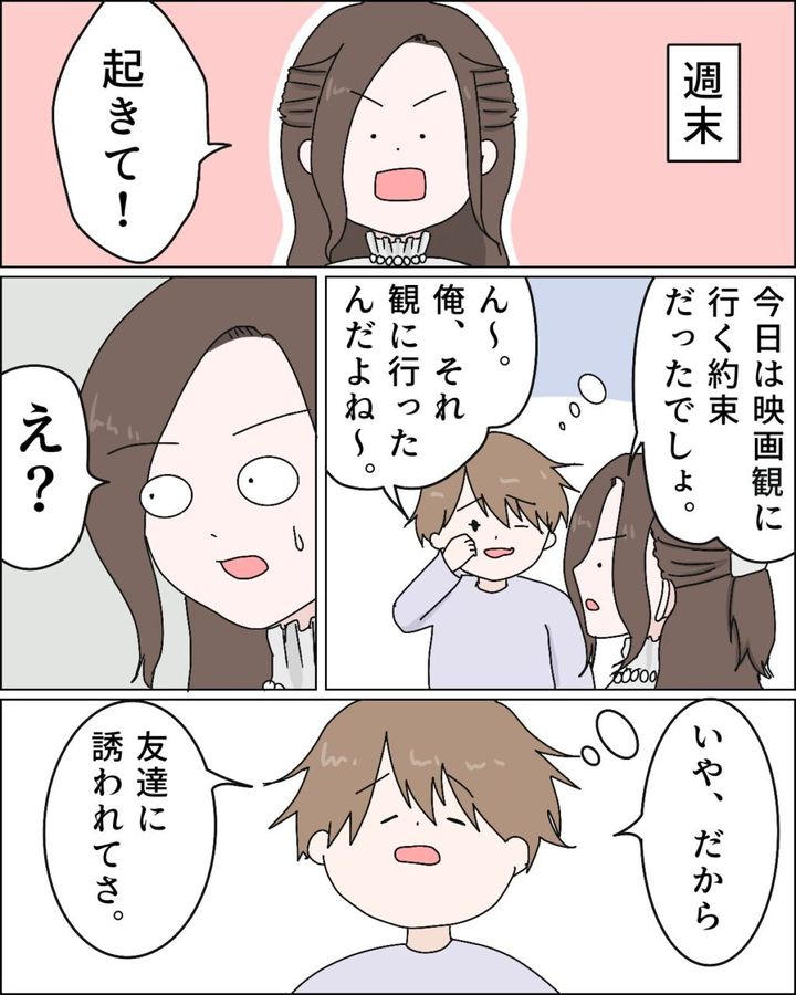 週末。「起きて!今日は映画観に行く約束だったでしょ」準備万端のエミさんがレイさんを起こすと、眠そうに目をこすりながら「ん~。俺、それ観に行ったんだよね~」と答えるレイさん。驚いたエミさんが「え?」と聞き返すと、レイさんは「いや、だから、友達に誘われてさ」と悪びれもせず言いました。