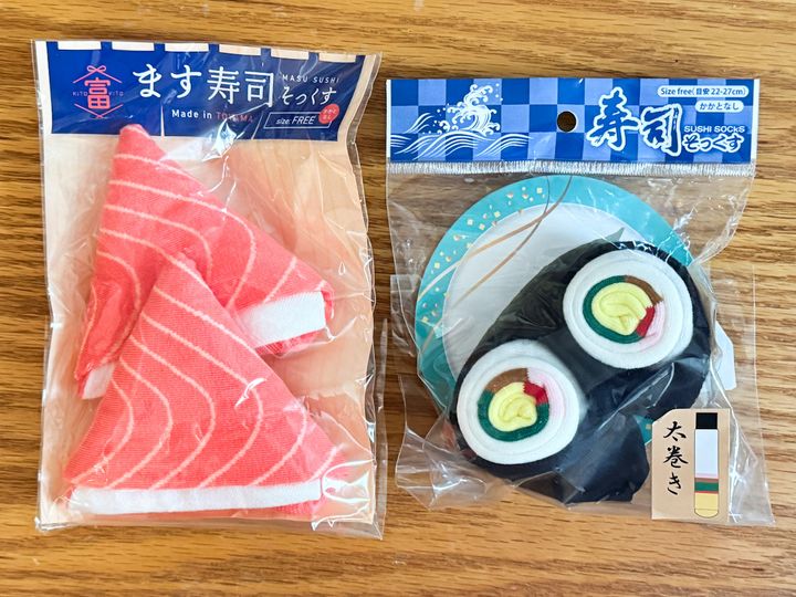 「寿しソックス」は、今回紹介した「ます寿司」と「太巻き」のほかにも、「いくら寿司」、「エビ寿司」、「マグロ寿司」、「玉子寿司」、「カルフォルニアロール」、「タコ寿司」などもあるのでぜひチェックしてみてくださいね。