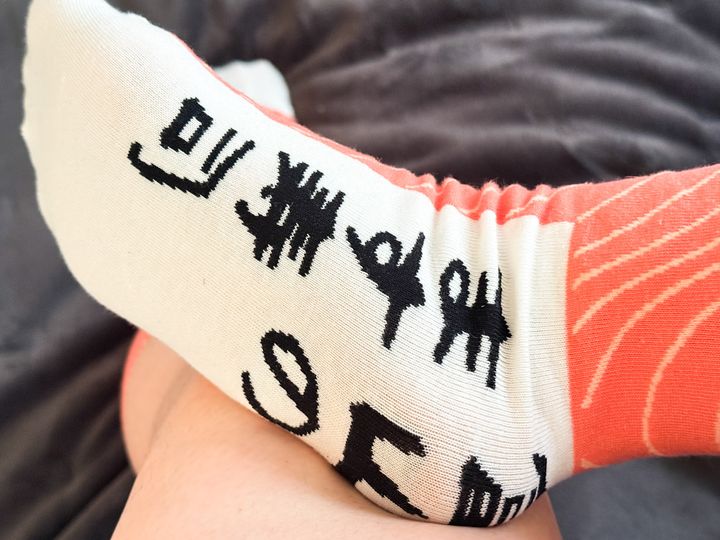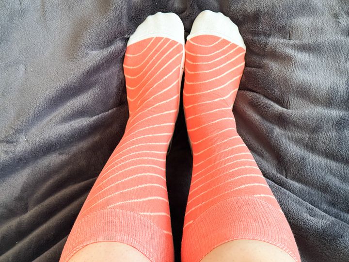 実際に「寿司そっくす」を履いてみました!「ます寿司」は膝下くらいのハイソックス。履いてみると、斜め細ボーダーのサーモンピンクの靴下という感じで違和感はありません。