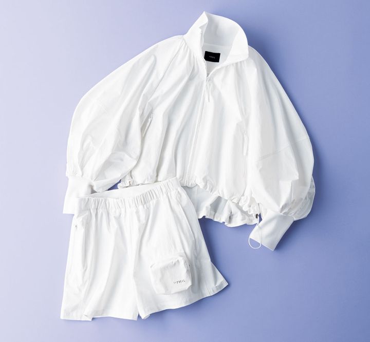 ボリューミーな袖と細く長い袖口が女っぽい。パンツのポケットがポイントに。ジャケット・ショートパンツ(ともにLE PHIL)