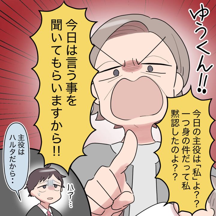 「ゆうくん!!今日の主役は『私』よ??一つ身の件だって私黙認したのよ??今日は言う事を聞いてもらいますから!!」と大きな声で言う義母に、「ハァ・・主役はハルタだから・・」とゆうさんは呆れかえるのでした。