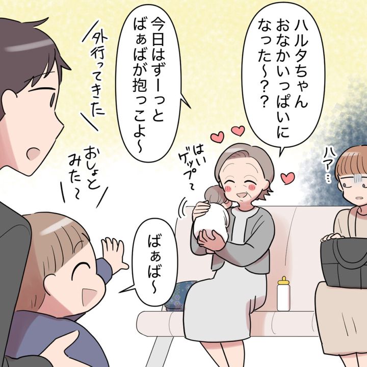 「ハルタちゃん、おなかいっぱいなった~??今日はずーっとばぁばが抱っこよ~」ハルタくんにミルクをあげ、大満足の義母。その隣でマキさんは、青ざめた顔で座っていました。そこに外に行っていたカナタくんとゆうさんが。「ばぁば~」カナタくんが声をかけると、