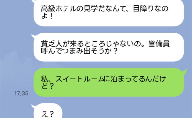 しかし、すぐさま幼なじみは「この高級ホテル、ロビーが素敵だから泊まれない庶民がロビーの見学に来るんだってね!あんたもその1人でしょ!」「私たちが泊まってるお部屋はスイートルームで最上階のオーシャンビューよ!あんたは一生見られない景色でしょうね!」と、マウントを取ってきました。