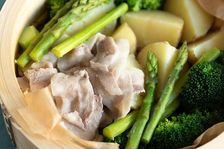 せいろにクッキングペーパーを敷き、じゃがいもを並べる。鍋に湯を沸かしてせいろをのせ、蓋をして強火で7分ほど蒸す。火を止めてじゃがいもの上に豚肉を並べ、Aをふる。空いているところにブロッコリー、アスパラも入れ、蓋をして再び強火にかけて5分ほど蒸す。