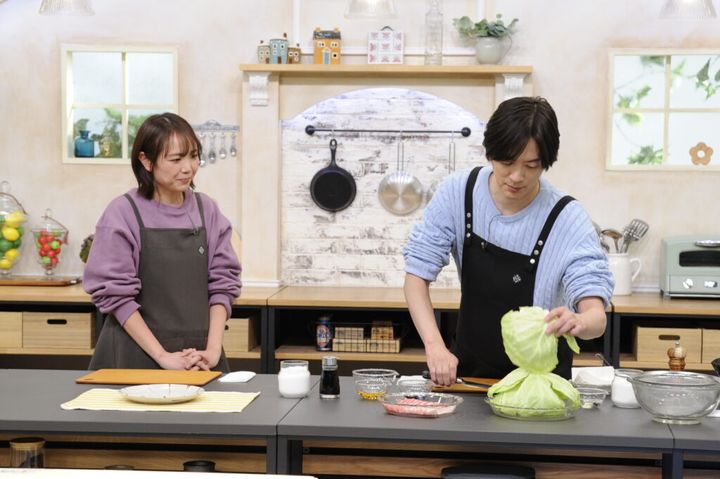 「では、キャベツからいきまーす」と迷いなくキャベツの芯を取り、一口大にサクサクと切っていくDAIGO。さっそくゆりさんから「いいですねー」とお褒めの言葉をいただくと、ますます調理もはかどるようで、「こちらも食べやすい大きさで…」と料理の先生ばりの解説を交えながら豚肉をカットするなど絶好調だ。