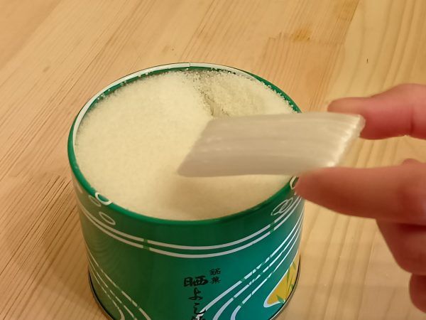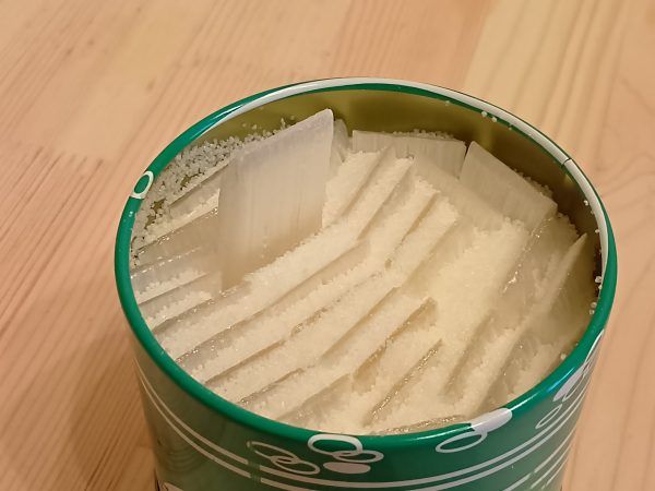 では、いよいよ頂いてみます。 口に含むと、とっても軽くてパリパリン。舌の上でシュワワ〜。そしてサーっと溶けて、優しい甘さが広がります。 シンプルなのに、なんて美味しいのでしょう。 もう一枚、もう一枚とつい手が伸びてしまいます。 子供と取り合い、缶の周りは粒だらけ(笑)
