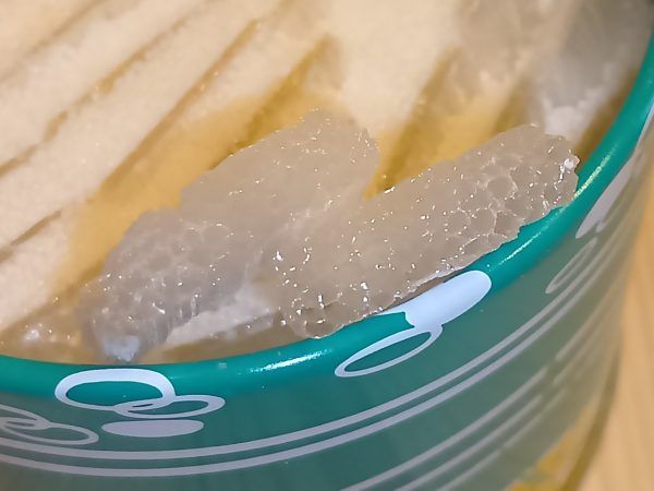 おぉ〜。真っ白な粉雪のような粒の中に、微かに晒よし飴が見え隠れしています。